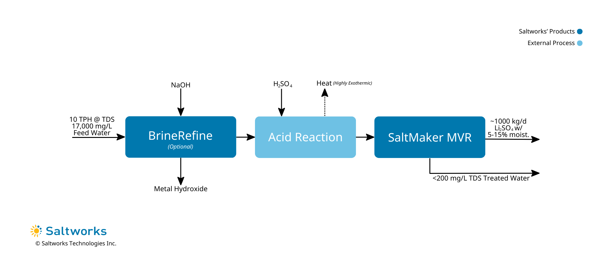 - Treatment Method: Optional precipitation of metals to improve purity through BrineRefine, while monitoring calcium sulfate precipitation, followed by acidification with sulfuric acid to convert all hydroxides to sulfates (removes the mixed carbonate-hydroxide salt issue), followed by an evaporative crystallizer, such as SaltMaker MVR, to produce lithium sulfate. An optional drier may be added.