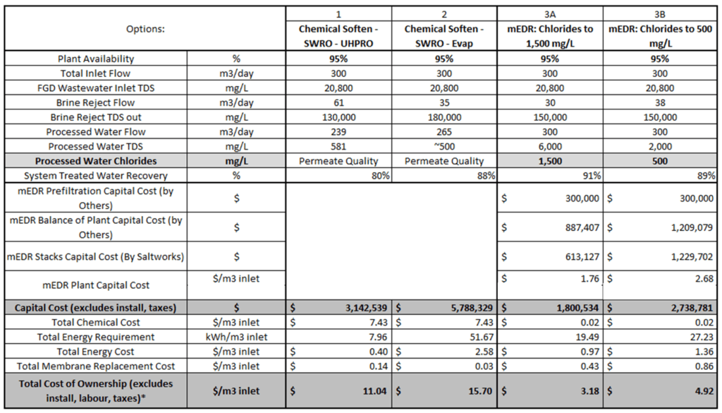 • mEDR can save up to 50% in capital (no need for chemical softening and thermal system) and operating costs for FGD wastewater treatment, compared to options 1 and 2.