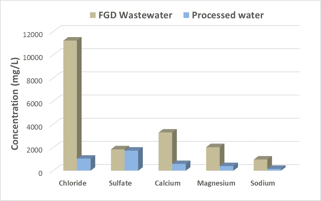 Flue gas desulfurization (FGD) systems in coal-fired power plants are used to remove sulfur dioxide (SO2) air emissions. FGD systems create wastewater that is often saturated with calcium sulfate while containing both metals and chlorides. FGD water is recycled internally and then purged out of the system when chloride concentrations exceed a set level. High chloride concentrations inhibit SO2 absorption from the flue gas and create corrosion concerns with wetted equipment. Chloride blowdown levels range with operations from 10,000 mg/L to as high as 30,000 mg/L.