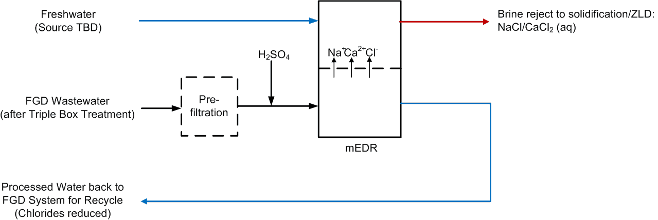 • Chlorides can be selectively removed from FGD wastewater by industrially available electrodialysis reversal (EDR) with monovalent selective membranes (mEDR). mEDR selectively transports chlorides under an electric field through monovalent anion exchange membranes while blocking sulfates. This reduces the chloride load to enable internal FGD recycle while producing a non-scaling brine of sodium/calcium chloride at greater than 90% recovery (or 10% brine waste volume).