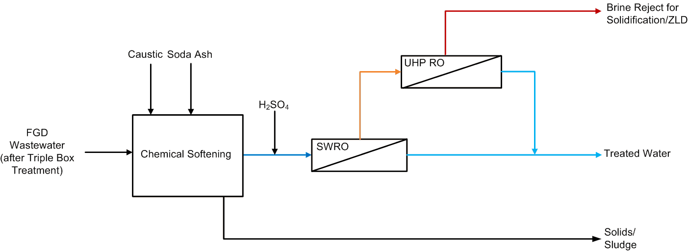 Simplified process flow diagram of chemical softening and reverse osmosis for FGD wastewater
