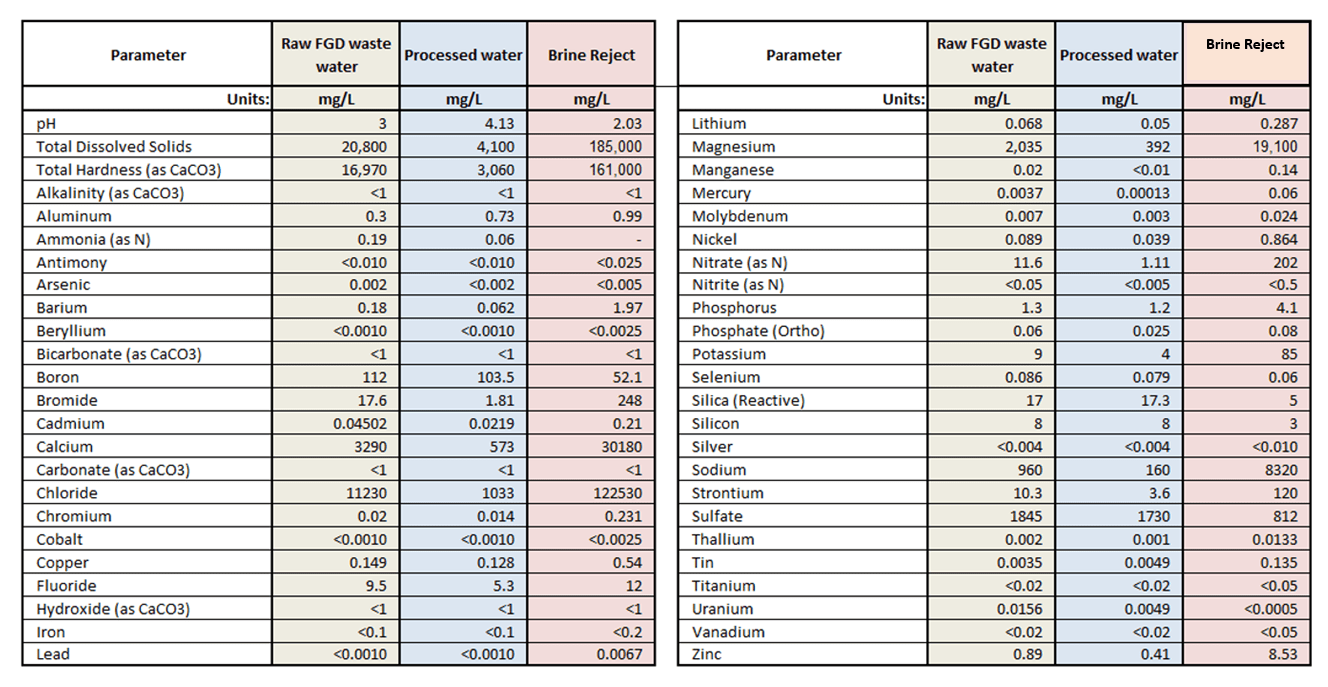 Table 1. Water chemistry data for FGD wastewater, processed water and reject brine.