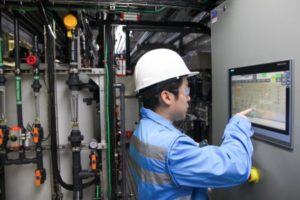Photo of a Saltworks engineer testing and inspecting water in an industrial wastewater treatment process