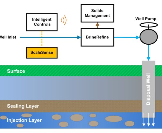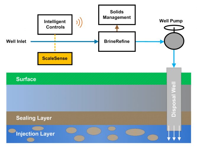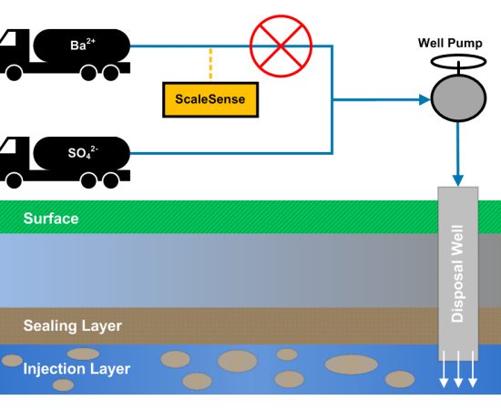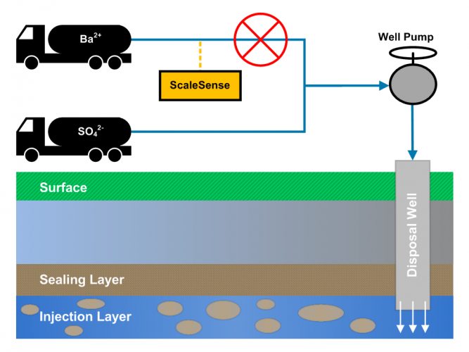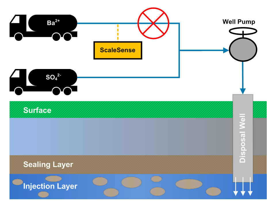 Illustration of a real-time ion sensor protecting disposal wells from plugging by mixing of incompatible ions
