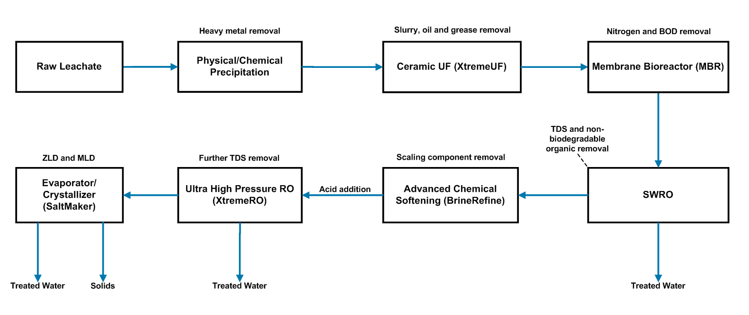 Process flow diagram showing comprehensive treatment steps for landfill leachate.