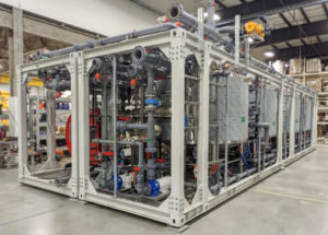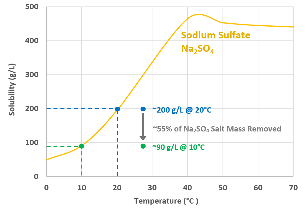 Our engineers hybridized UHP-RO with a chilled crystallizer system, in a semi-closed loop that concentrates water, extracts solid salt, and repeats the cycle. The UHP-RO system can concentrate certain salts (e.g. sodium sulfate) to over 20% by mass. Examples of suitable ions include: Na+, K+, NH4+, CO32-, and SO42-. The concentrated brine solution then enters our chilled crystallizer, which takes advantage of steep solubility changes with temperature. There, the solution cools, resulting in the formation of salt crystals, which can be separated and removed.