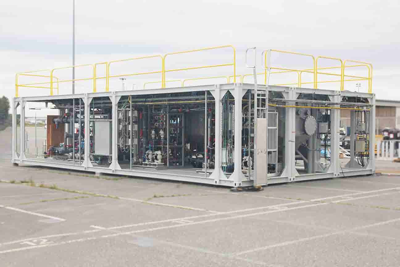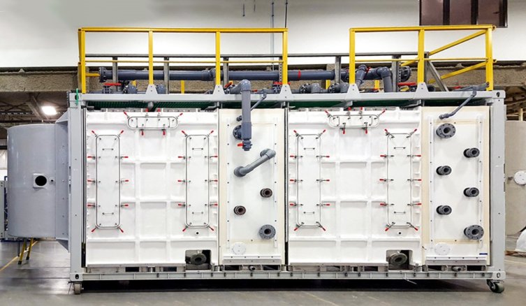 The modular design uses pre-fabricated ISO-container-sized blocks for cost-effective transport and rapid site installation. Modules slide in and out for easy inspection and maintenance and are easily added to expand capacity.